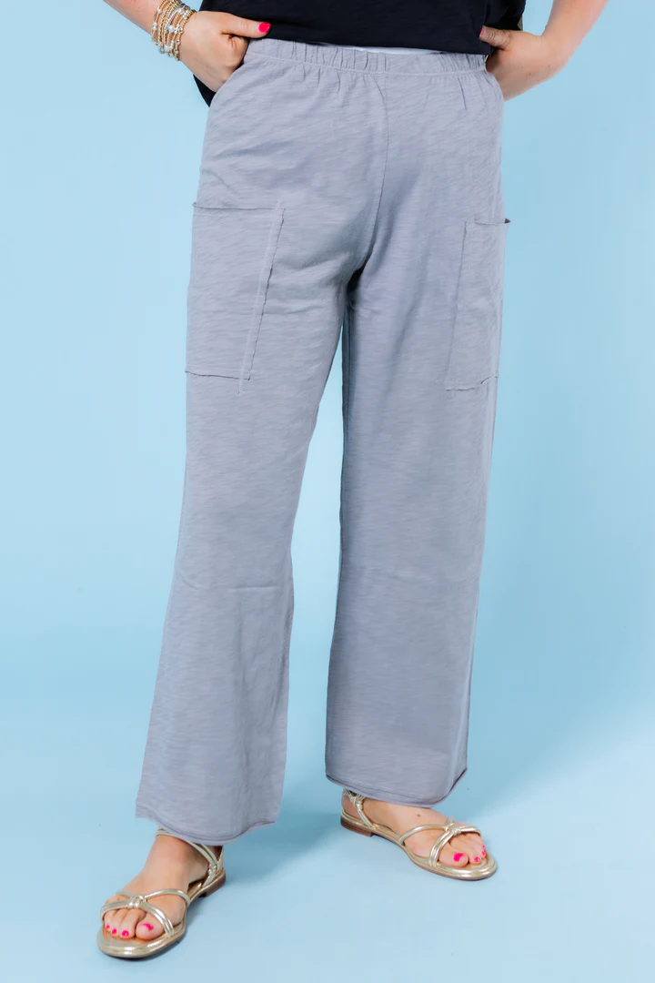 A super comfy cotton pant with a no bulk elastic waistband, an extended rise and a full leg with raw edges at the hemline. Pouch pockets at the hip stash your essentials. Add your favorite tee or tank for a fun everyday look.