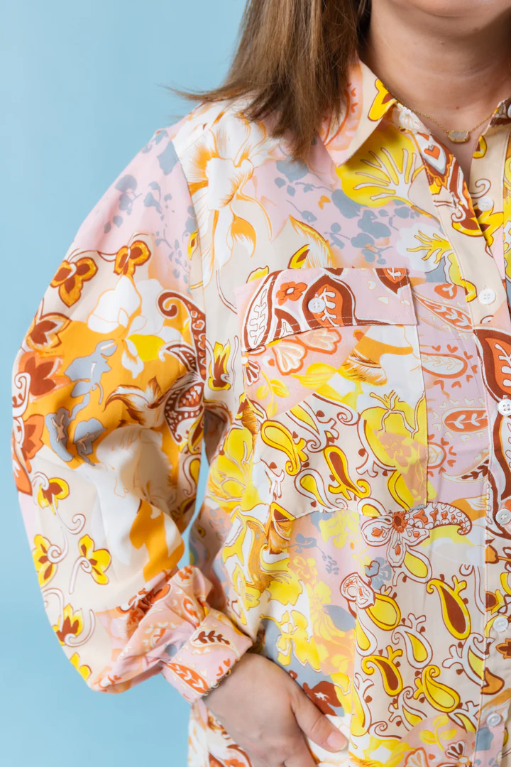 Get ready to bring some bold and playful vibes to your wardrobe with The Sunset Paisley Blouse. Featuring an abstract print and a convenient breast pocket, this button down shirt is perfect for adding a touch of fun to any outfit. Step out in style with this unique and quirky piece!